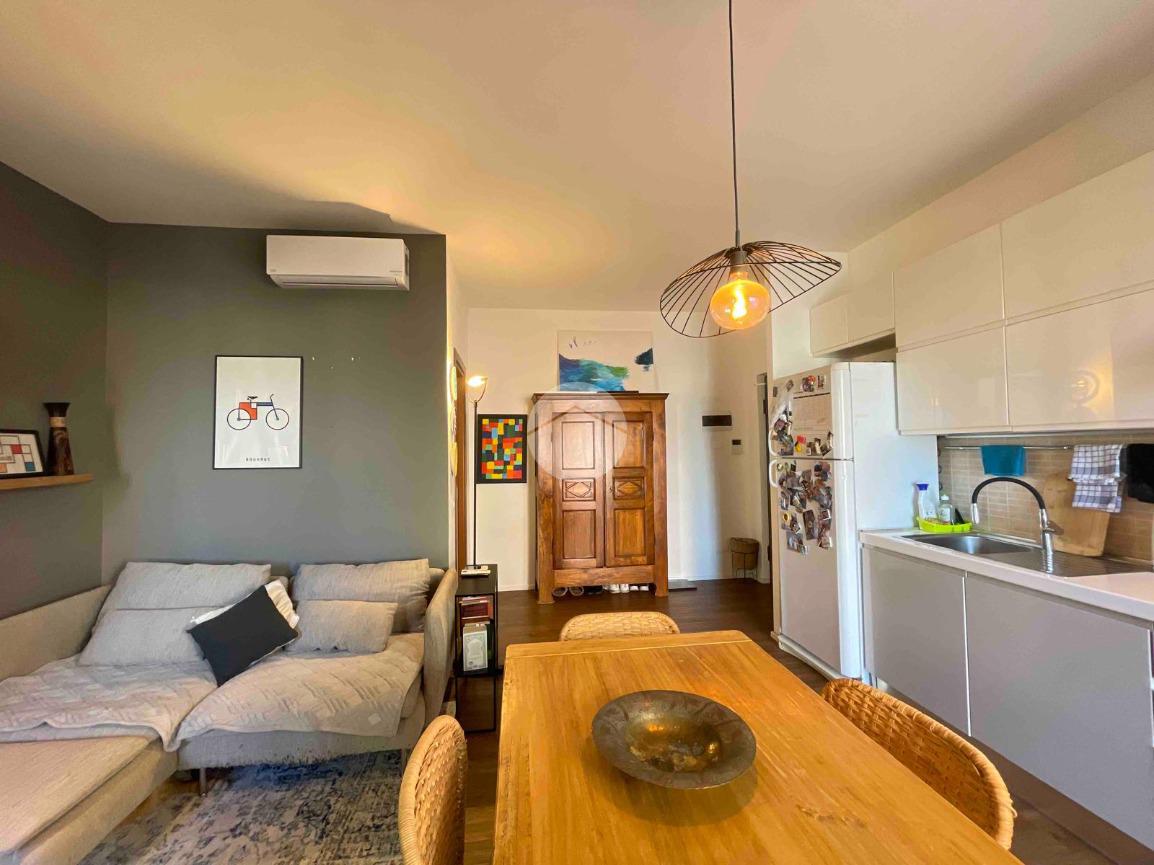 Entrando, abbiamo la zona giorno, che si presenta con una cucina a vista sul soggiorno e da dove si può accedere al primo balcone.
