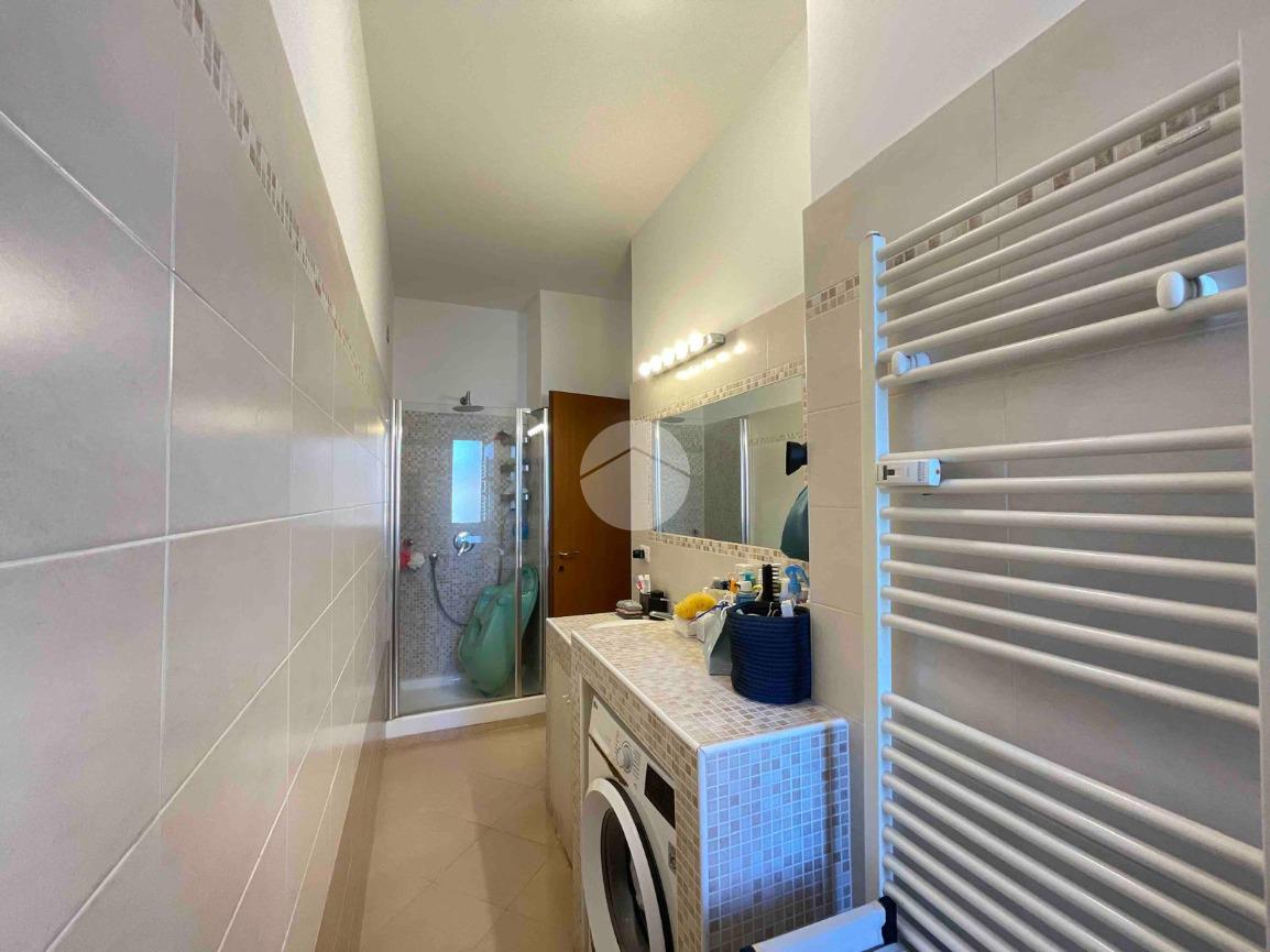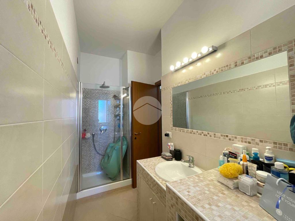 Proseguendo, troviamo il bagno finestrato, che si presenta con una doccia e con un tema mosaico, che ci accompagna al suo interno.