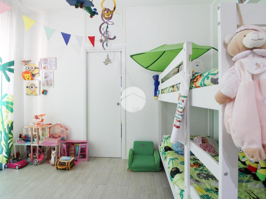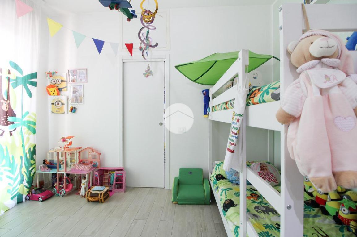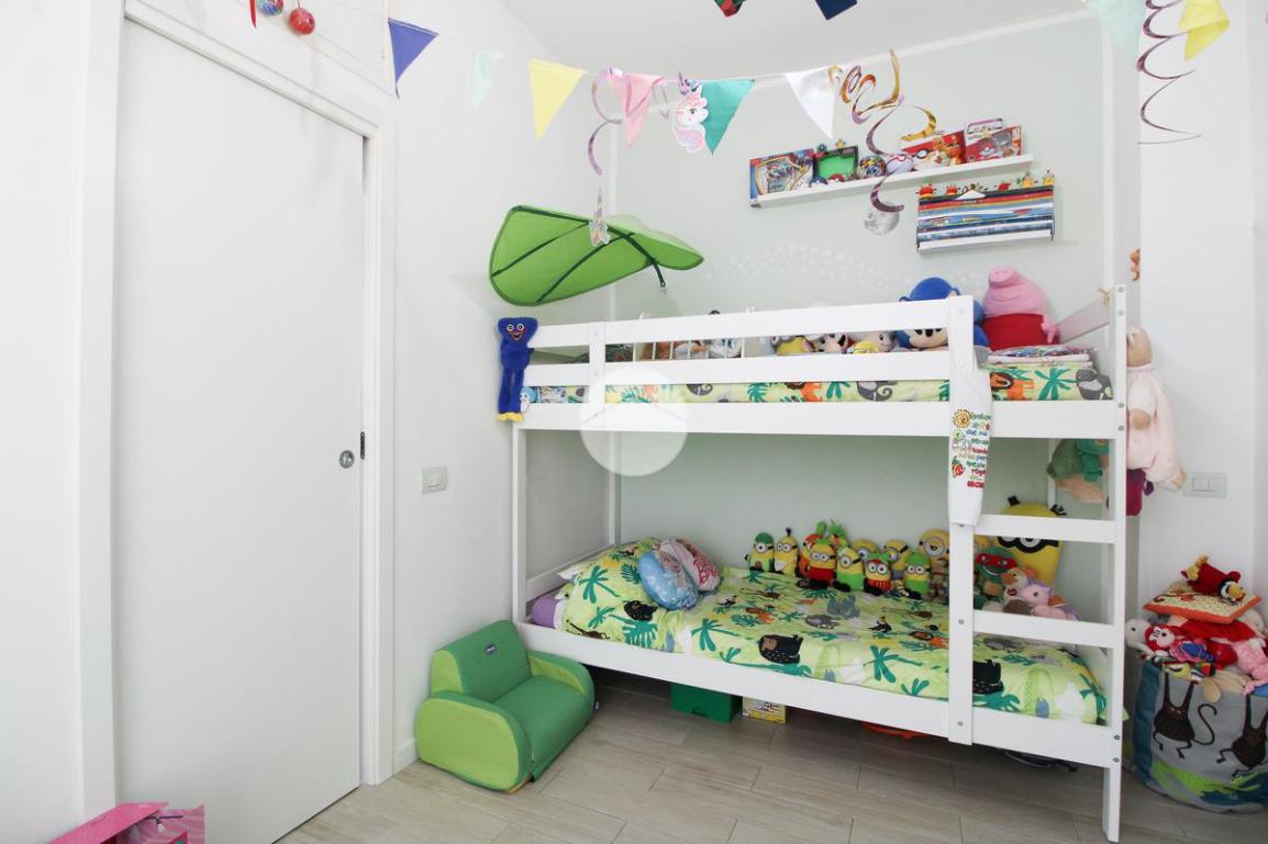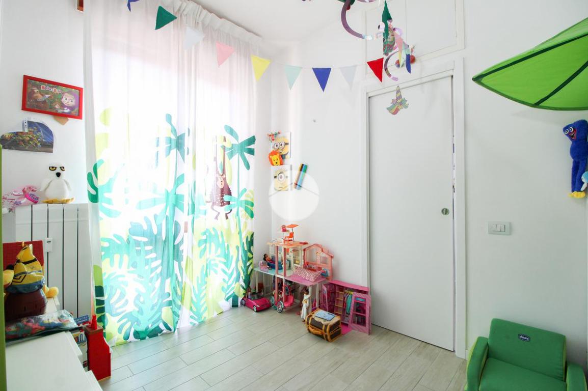 Entrando, troviamo subito a destra la cameretta, fornita di cabina armadio e dalla quale è possibile accedere al primo balcone.