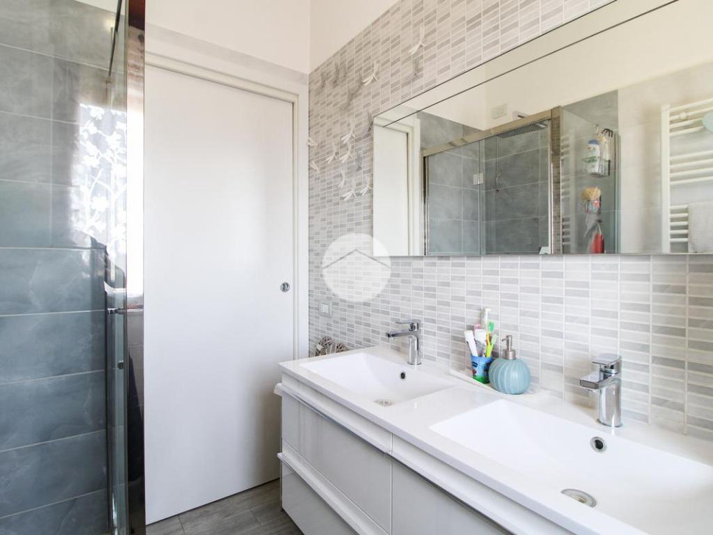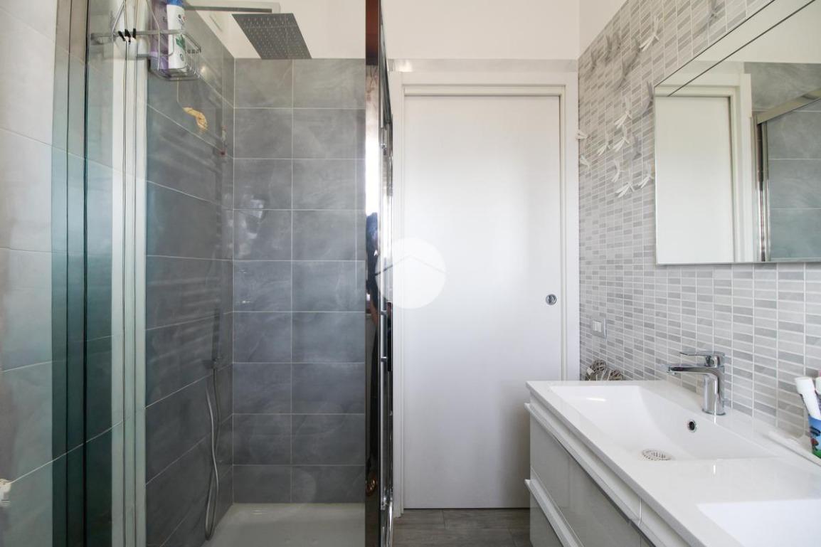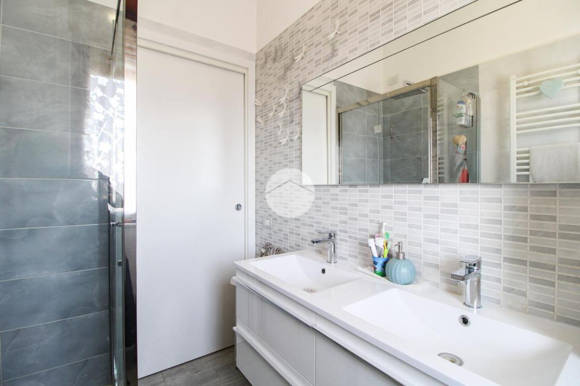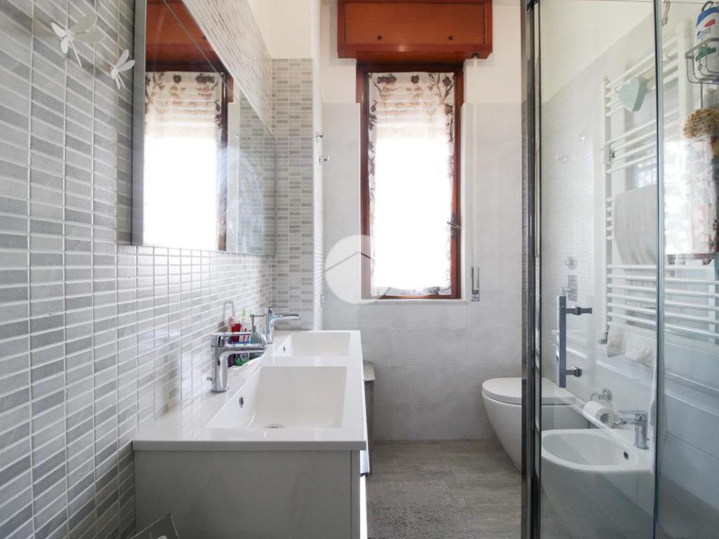 Proseguendo, abbiamo il bagno finestrato con affaccio sul balcone prima descritto, dotato di doccia e doppio lavabo.