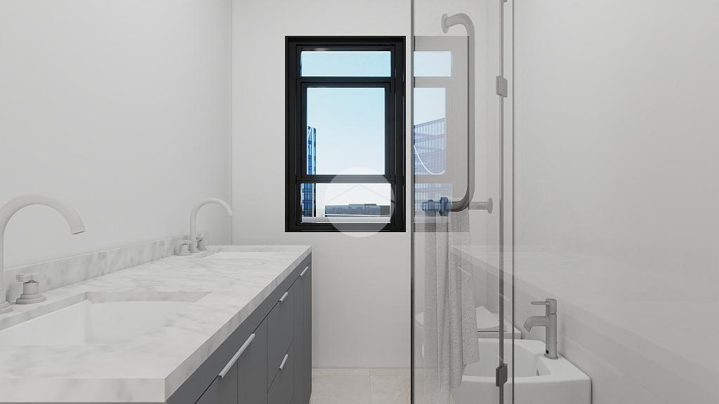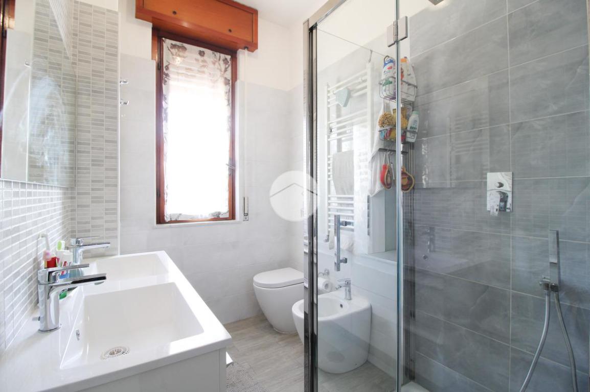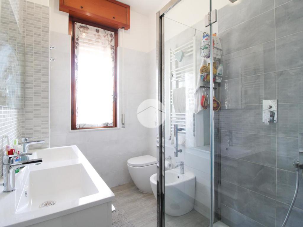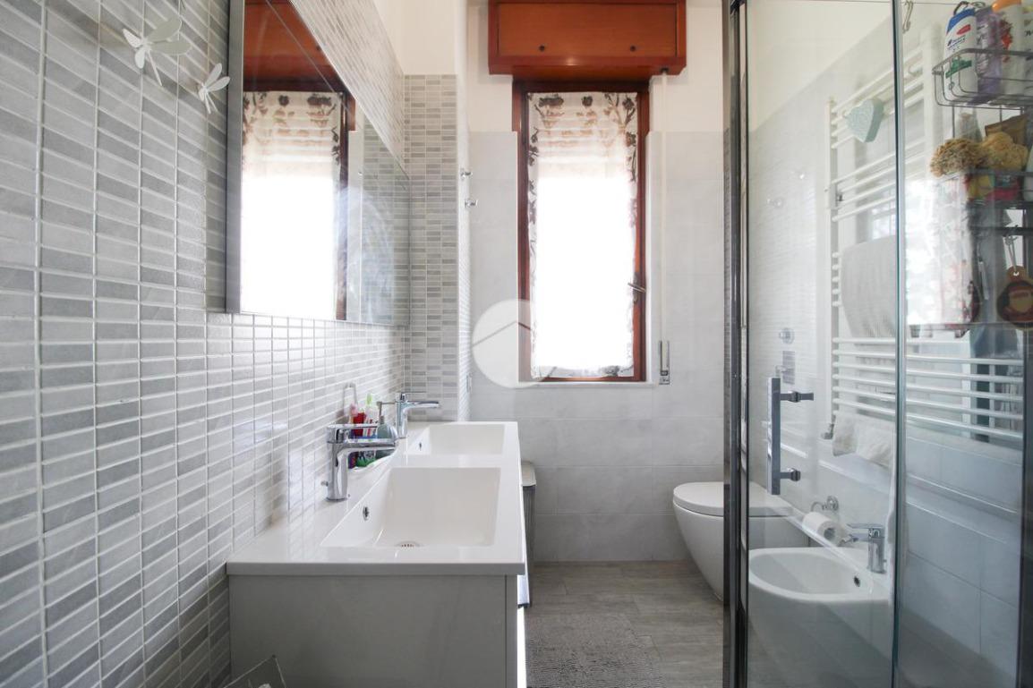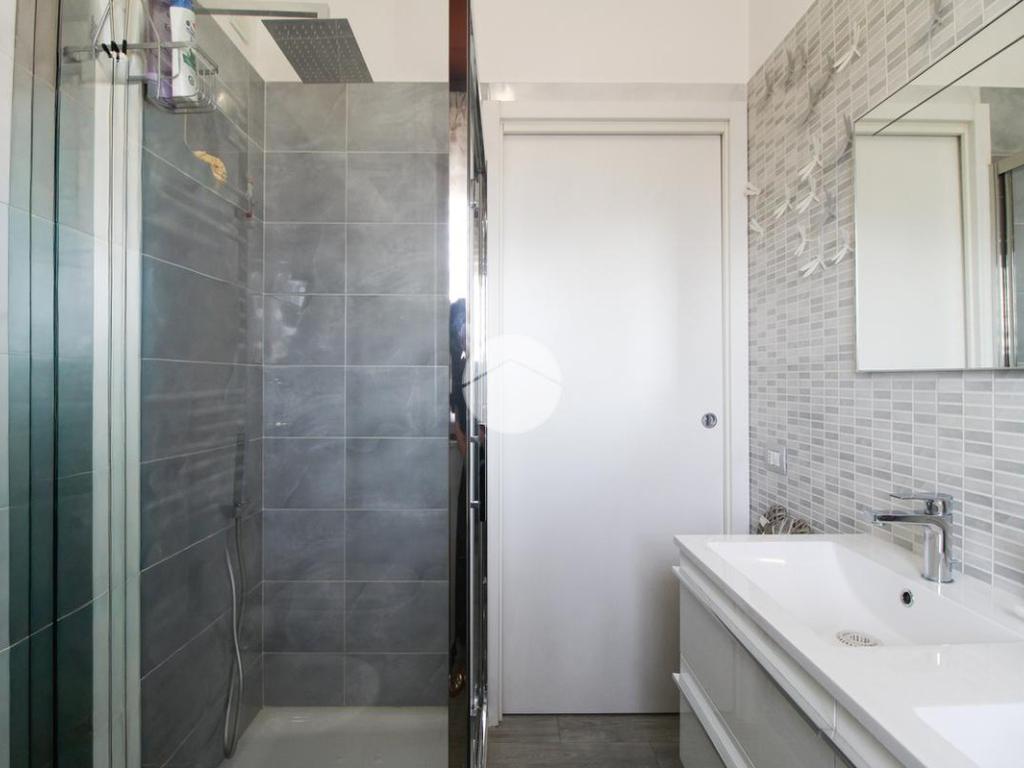 Proseguendo, abbiamo il bagno finestrato con affaccio sul balcone prima descritto, dotato di doccia e doppio lavabo.